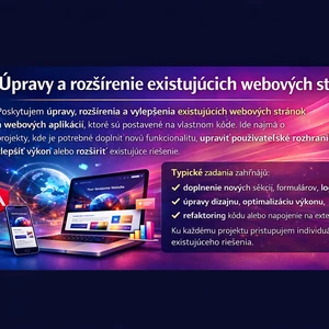 Poskytuji úpravy, rozšíření a vylepšení stávajících webových stránek a webových aplikací, které jsou postavené na vlastním kódu. Jedná se především o projekty, kde je potřeba doplnit novou funkcionalitu, upravit uživatelské rozhraní, zlepšit výkon nebo rozšířit stávající řešení.